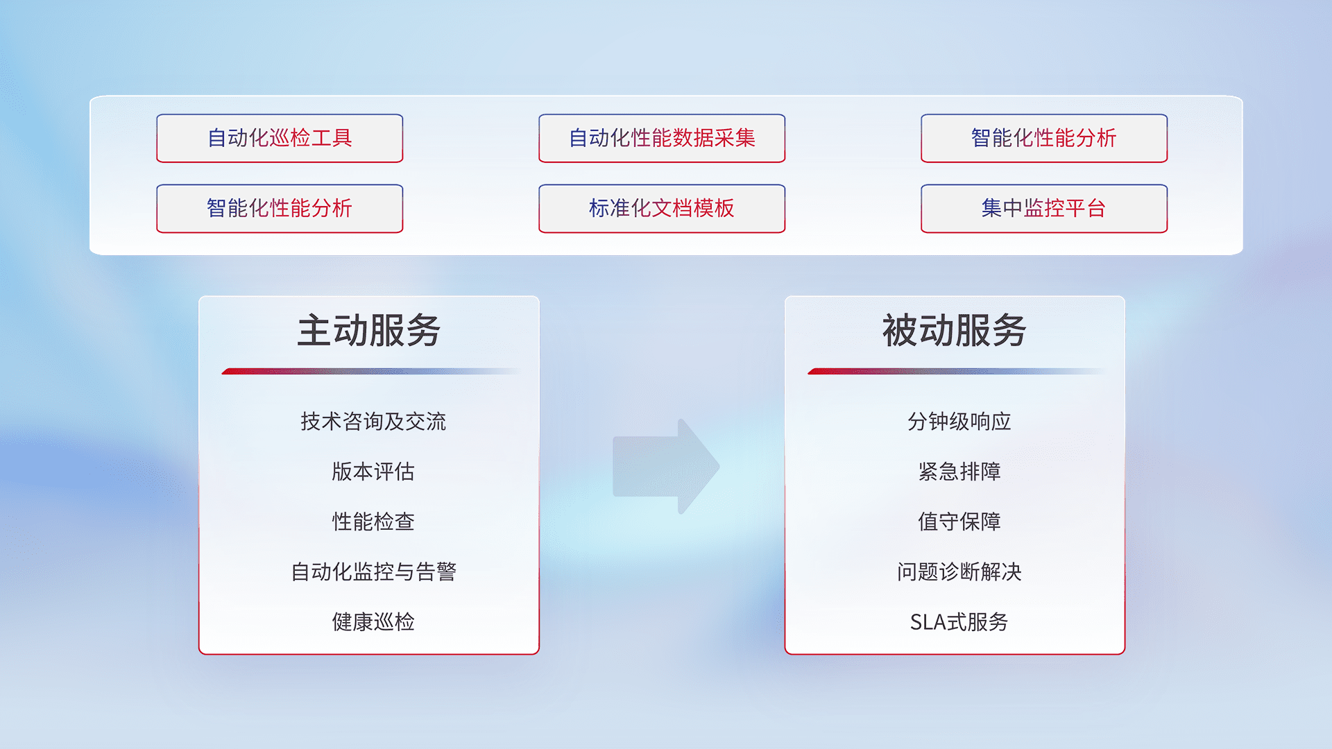 智能化工具和标准化文档,,保障服务质量,,,提供主动服务(包含技术咨询、、、、版本评估、、、性能检查、、自动化监控与告警、、、、健康巡检)和被动服务包含(分钟级响应、、、紧急排障、、、值守保障、、问题诊断解决、、、、SLA服务)。。。。